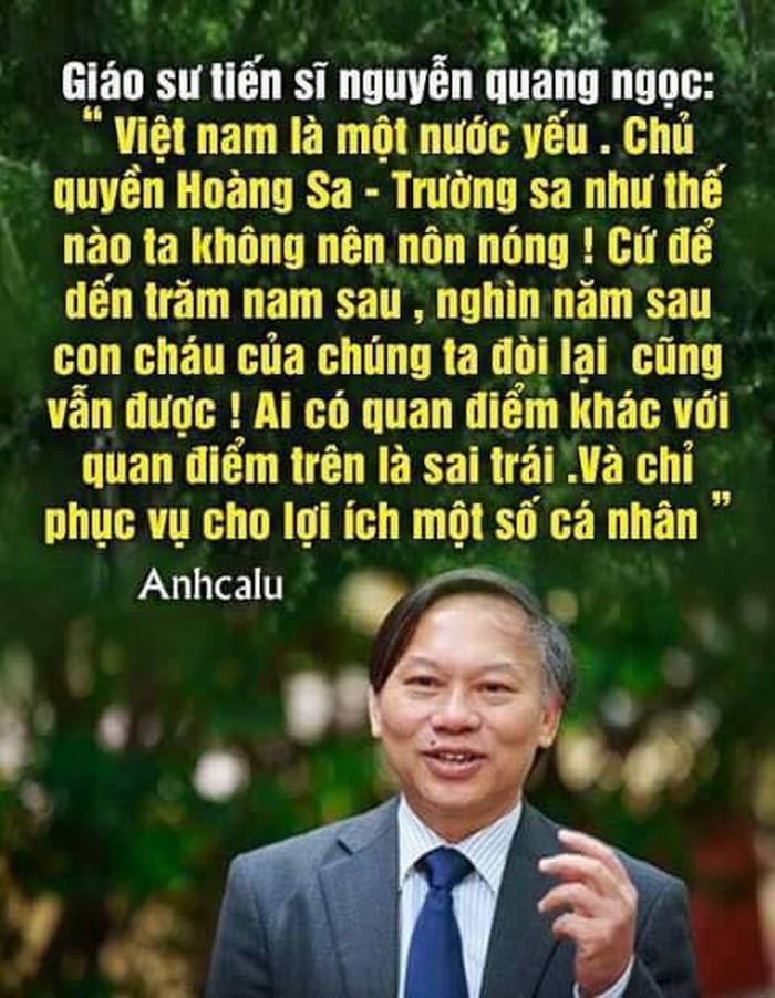 "Việt Nam là một nước yếu. Chủ quyền Hoàng Sa- Trường Sa như thế nào ta không nên nôn nóng. Cứ để đến trăm năm sau, nghìn năm sau con cháu chúng ta đòi lại cũng vẫn được. Ai có quan điểm khác với quan điểm trên là sai trái. Và chỉ phục vụ cho lợi ích một số cá nhân”.
