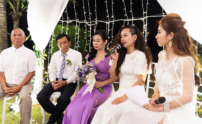 Trong không khí xúc động, chị Na đưa mẹ vào hôn trường, trao tay mẹ cho ông Quý. Giây phút lắng đọng, chị Na nghẹn ngào cất tiếng gọi ông Quý là bố. Bộ áo dài cưới màu tím là món quà do Hoa hậu Ngọc Hân thiết kế và gửi tặng cặp đôi.