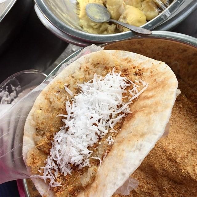 Xôi được cuốn trong lớp bánh tráng nướng, phết sầu riêng lên thêm nước cốt dừa và cơm dừa nạo sau cùng là rắc đậu phộng lên rồi cuộn lại. Hạt xôi dẻo thơm thơm quyện với đậu xanh, ngào ngạt mùi sầu riêng ăn rất ngon và lạ miệng.