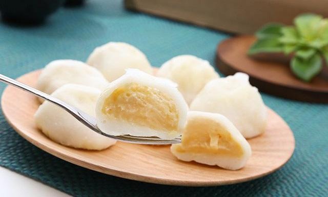 Mochi sầu riêng: Bánh mochi cũng không thể bỏ qua hương sầu riêng trong menu của mình. Chiếc bánh ngọt nhỏ nhắn với phần vỏ dai mềm, bên trong là phần nhân kem hoà quyện với vị ngọt bùi của sầu riêng. Bánh mochi ngon nhất là khi ăn lạnh. Mochi sầu riêng tuy không phổ biến như các món còn lại, nhưng vẫn được xem là sự kết hợp ăn ý của sầu riêng và chiếc bánh gạo Nhật.