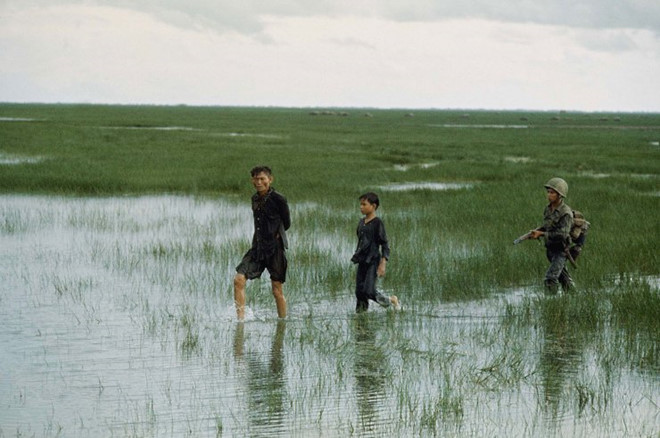 Đứa con đi theo cha, một người đàn ông mà lính Việt Nam Cộng hòa nghi là du kích.