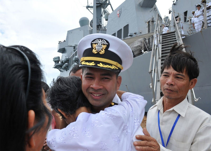 Michael Vannak Khem Misiewicz được người thân chào đón khi tàu khu trục USS Mustin tới Sihanoukville, Campuchia. (Ảnh: Hải quân Mỹ)
