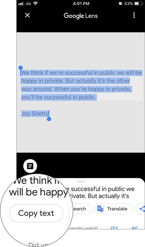 Sau khi chọn văn bản, Google sẽ hiển thị một số tùy chọn ở dưới cùng của màn hình như Copy Text, Search, hoặc Translate.