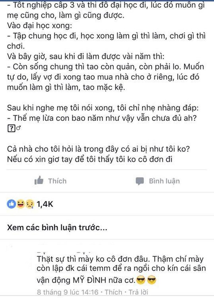 Có người lại dí dỏm “đóng vai bà mẹ” để nhắc nhờ: “Mày không thoát được đâu con trai”, “ Lấy vợ đẻ con ở riêng đi, răng có rụng thì mày vẫn là con tao, bao giờ tao chết thì mày muốn làm gì thì làm”… – những bình luận khiến chúng ta (cả cha mẹ và con cái) cùng nhìn lại chính mình.