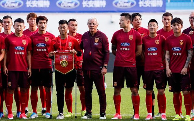 He YiYi với đôi nạng chụp ảnh lưu niệm trong đội hình cầu thủ ra sân. Ảnh: Sohu.