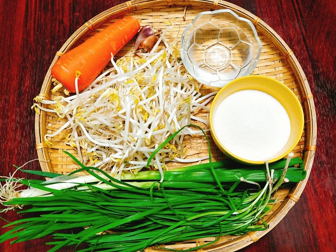 Với cà rốt bạn hãy rửa sạch, nạo vỏ, bào thành những sợi nhỏ, dài bằng giá đỗ và để ráo nước hoàn toàn.