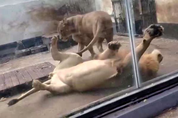 Theo những gì camera giám sát quay được, sư tử đực tiến lại gần sư tử cái đang nằm phủ phục sát tường kính bên trong chuồng, định bụng nằm dựa vào "nàng".