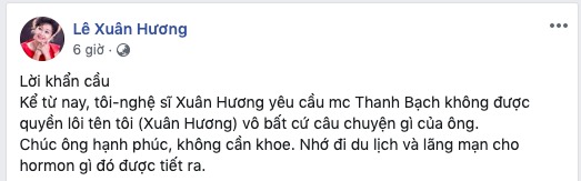 Sau những ồn ào không mong muốn, mới đây nhất trên trang cá nhân, nghệ sĩ Xuân Hương tiếp tục có dòng trạng thái xoay quanh sự việc. Cụ thể, nữ nghệ sĩ viết: "Lời khẩn cầu. Kể từ nay, tôi - nghệ sĩ Xuân Hương yêu cầu MC Thanh Bạch không được quyền lôi tên tôi (Xuân Hương) vô bất cứ câu chuyện gì của ông.