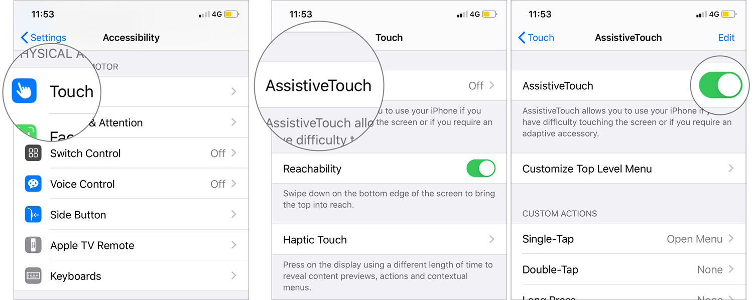 Bước 2: Kế đến, bạn chọn Touch, sau đó chọn AssistiveTouch, và bật công tắc nằm bên cạnh mục này. Ngay lập tức, bạn sẽ thấy biểu tượng AssistiveTouch xuất hiện trôi nổi trên màn hình.