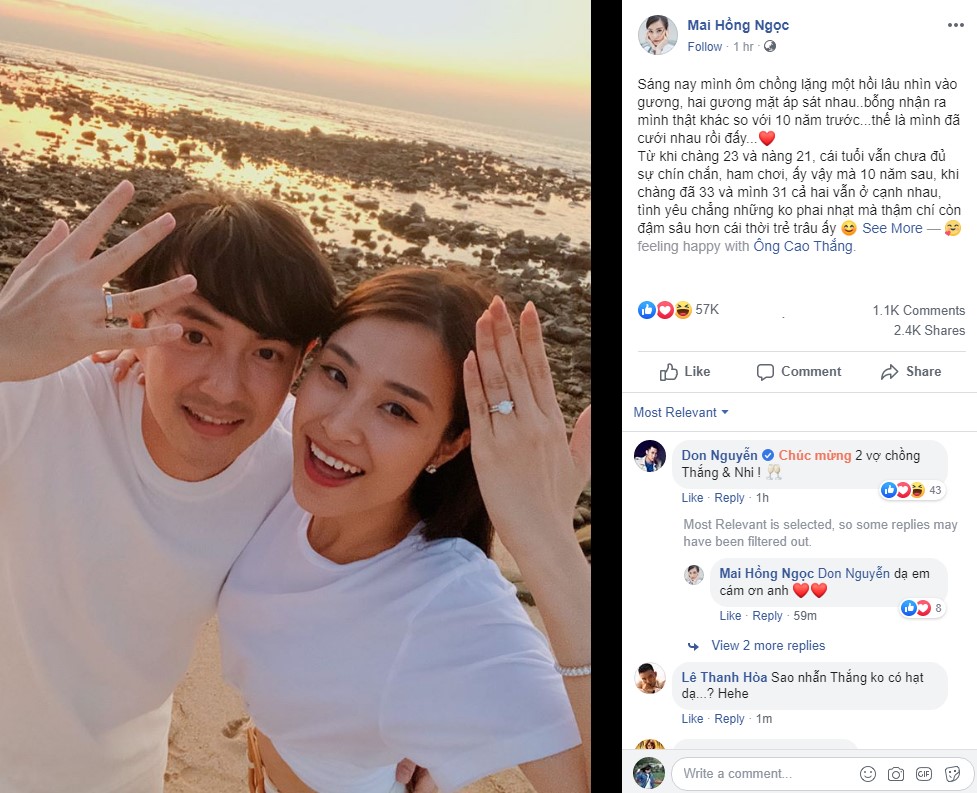 Bài viết của Đông Nhi thu hút hơn 50.000 lượt thích và hàng ngàn bình luận chỉ sau gần 1 giờ đăng tải. Trong đó, không ít nghệ sĩ như Don Nguyễn, Song Luân, Bảo Anh, Ngô Kiến Huy cũng đã gửi lời thăm hỏi và chúc phúc tới cặp đôi này.