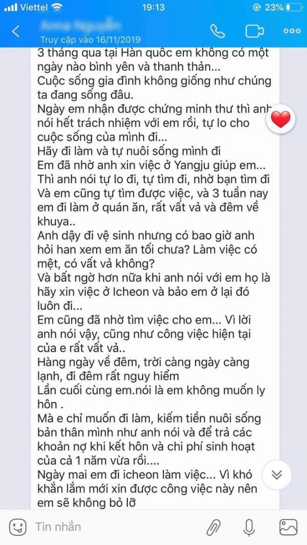 "Em sang Hàn Quốc 2 ngày, thời gian đầu tiên bỡ ngỡ cần được yê*u thư*ơng, quan tâm thì anh lại có hàn*h độn*g khiến em s*ợ hã*i. Anh đã né*m sách tiếng Hàn trong khi em đang ngồi bàn ăn để học và lúc đó mới có 9h tối ở Hàn Quốc và 7h tối ở Việt Nam. Thậm chí, anh còn không định mua điện thoại cho em. Không muốn em liên lạc với bấ*t kì ai, thật đáng s*ợ!_._".