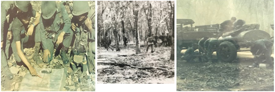 [Hình bên trái: Các sĩ quan Viễn thám vẽ đường đi trên bản đồ hành quân từ Lộc Ninh về An Lộc. Hình chính giữa: Chuyển quân trong rừng Lộc Ninh về An Lộc. Hình bên phải: Về đến An Lộc, đơn vị nhận tiếp tế thực phẩm và nước ngoài bìa rừng cao su.] (Hình ảnh: NTT/1972.)