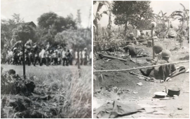[Hình bên trái: Đoàn người chạy trốn cộng sản từ hướng Phú Lố đi vào An Lộc, trong số này người Kinh có và Thượng có, tất cả tay sách nách mang, vừa đi vừa khóc. Hình bên phải: Lính Trinh sát 7/5 đóng quân trong một khu vườn bỏ hoang, ngay trên miệng hố cá nhân là súng chống chiến xa M 72, mọi người ăn, ngủ ngay bên cạnh hố cá nhân.] (Hình ảnh: NTT/1972.)