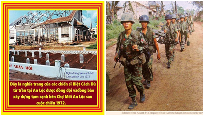 [Hình bên trái: Nghĩa trang 81 Biệt cách dù nằm bên cạnh ngôi chợ An Lộc hoang tàn đổ nát vì Bắc quân, hiện nay nghĩa trang này không còn tìm thấy. CSVN đã tìm đủ mọi cách phá đi những chứng tích lịch sử, tội ác không phải chỉ với người sống, mà chúng cũng không tha cả người chết. Hình bên phải: Các chiến sĩ Liên đoàn 81 Biệt Cách Dù trên đường vào giải toả An Lộc. "Chàng từ đi vào nơi gió cát - Đêm trăng này nghỉ mát phương nao?" Chinh Phụ Ngâm. Đặng Trần Côn.] (Hình ảnh: Picture of An Loc battle, Google.)