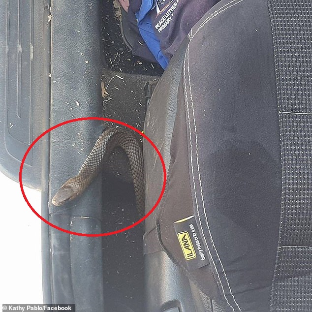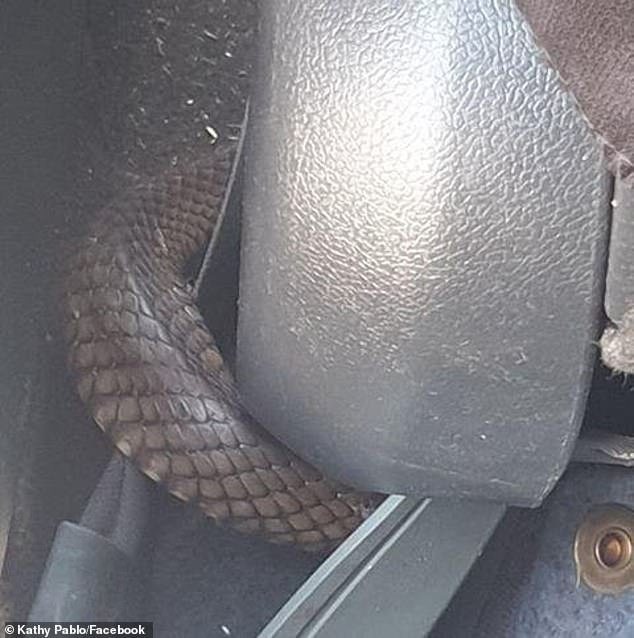 Kathy lập tức cho con ra khỏi xe và chụp ảnh lại con rắn đang bò bên dưới ghế ngồi của con và chia sẻ lên mạng xã hội Facebook.