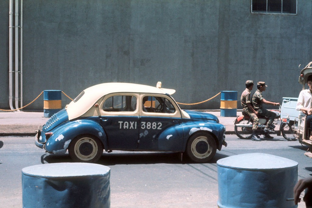 Hai chiếc taxi trên đại lộ Lê Lợi, Sài Gòn năm 1968. Hầu hết những chiếc xe taxi ở Sài Gòn giai đoạn trước 1975 đều thuộc dòng xe Renault 4CV của Pháp, được sản xuất từ năm 1947–1961.