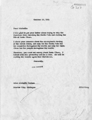 "Cháu không cần phải lo lắng về ông già Noel", Kennedy viết vào ngày 28/10/1961. "Bác đã nói chuyện với ông ấy hôm qua và ông ấy vẫn ổn. Ông ấy vẫn sẽ đi phát quà vào Giáng sinh này".