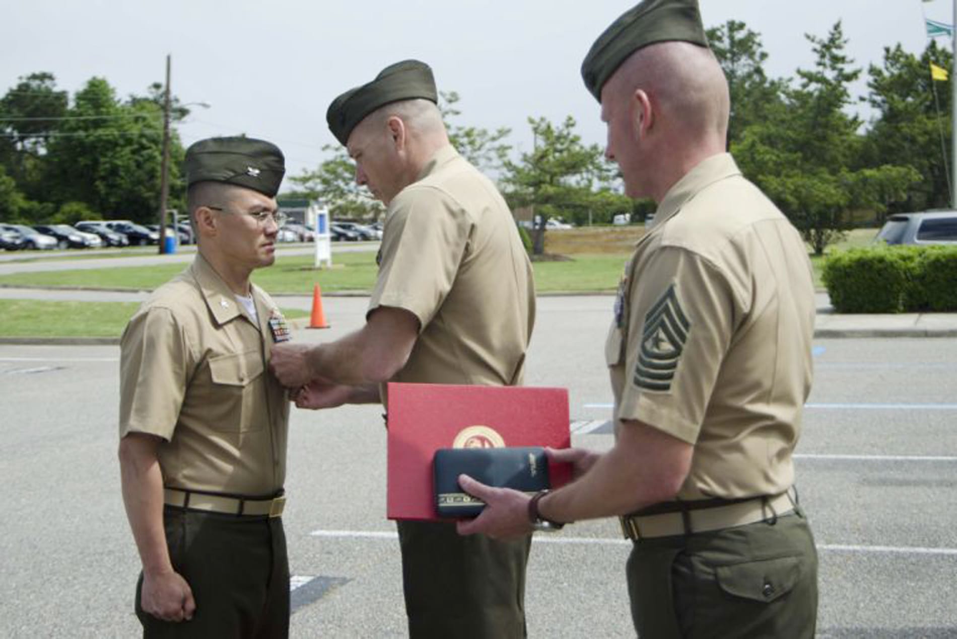 Đại Tá William Seely (trái) bàn giao chức chỉ huy trường huấn luyện tình báo và chỉ huy Thủy Quân Lục Chiến Hoa Kỳ hồi năm 2013. (Hình: Kayla King/US Navy)