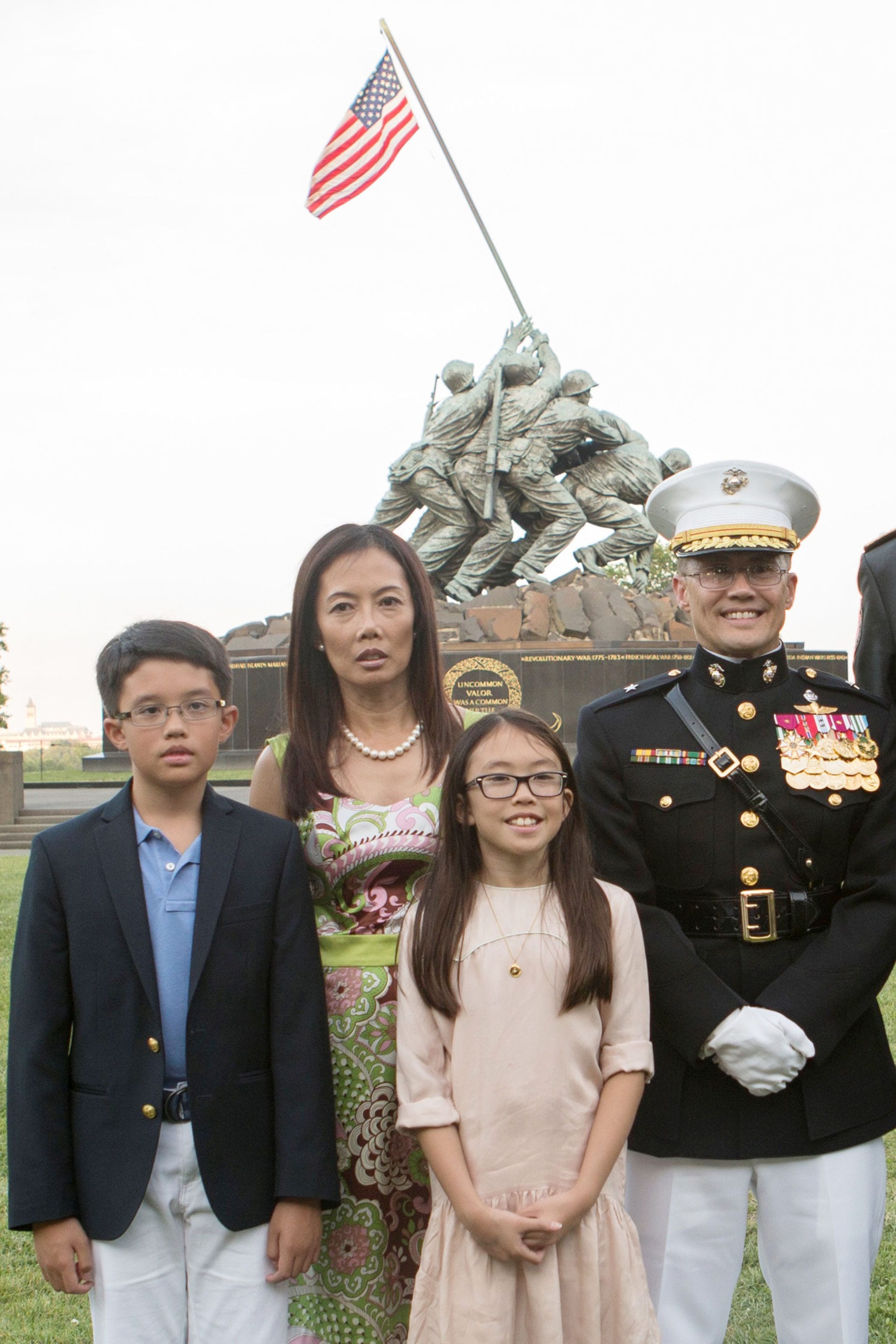 Chuẩn Tướng William Seely cùng vợ và hai con tại Đài Tưởng Niệm Thủy Quân Lục Chiến ở Arlington, Virginia, năm 2017. (Hình: Stephon L. McRae/US Marine Corps)