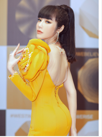 Hiếm khi xuất hiện tại các sự kiện nhưng khi đã tham dự, Elly Trần luôn có sự đầu tư hình ảnh chỉn chu. Đến với WeChoice Awards 2019, Elly Trần chọn chiếc đầm màu vàng của NTK Lâm Lâm. Bộ trang phục có phần điểm nhấn ở phần ngực và tay như đóa vàng rực rỡ. Thiết kế đuôi cá cũng giúp "bà mẹ hai con" khoe trọn thân hình đồng hồ cát với vòng eo 55cm và những đường nét gợi cảm trên cơ thể.