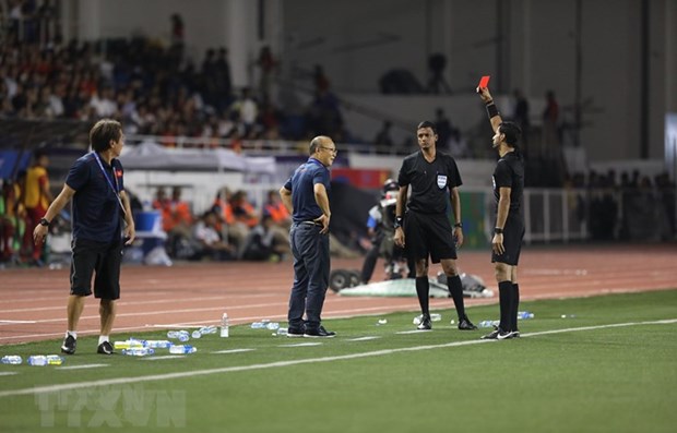 Huấn luyện viên Park Hang-seo nhận thẻ đỏ ở trận chung kết SEA Games 30 vì lỗi phản ứng. (Ảnh: TTXVN)