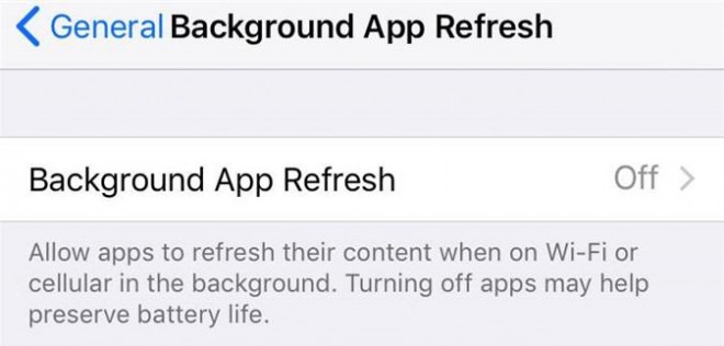 Nhiều ứng dụng liên tục làm mới nội dung kể cả khi chưa kích hoạt. Để tắt chế độ này, bạn chỉ cần vào Cài đặt> Cài đặt chung> Làm mới ứng dụng trong nền (Background App Refresh). Tại đây bạn có thể chọn tắt toàn bộ hoặc tắt những ứng dụng không cần thiết.