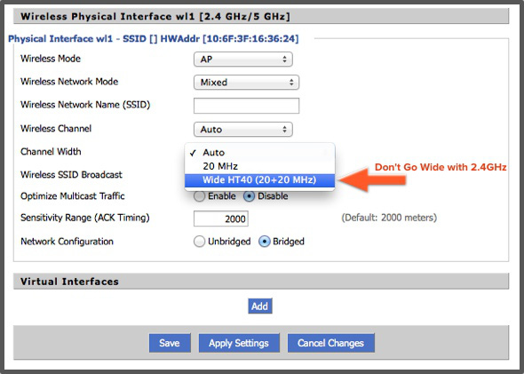 Một số router (không phải của Apple) sẽ cho phép bạn sử dụng các kênh "Wide" trên băng tần 2.4GHz. Vấn đề là khi ở mức băng tần này, sóng sẽ khá bị nhiễu và gây rối khi truy cập. Bluetooth cũng ở băng tần này, do đó việc lẫn sóng là không thể tránh khỏi. Hơn nữa, Apple cũng đă không hỗ trợ các kênh rộng 2.4GHz từ cách đây nhiều năm. Do vậy, ngay cả khi bạn bật kênh này trên router th́ iPhone hay MacBook cũng không thể truy cập được.