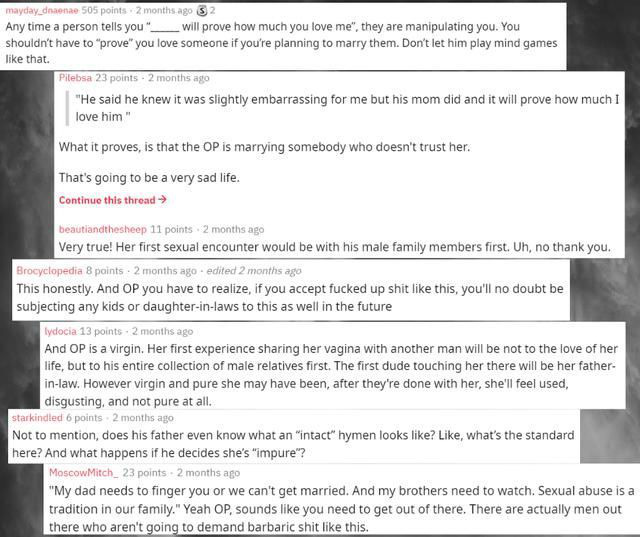 Một trong số các bình luận tiêu biểu phải kể đến là: "Bất kỳ khi nào có ai đó bảo bạn làm gì để chứng tỏ tình yêu của bạn với anh ta thì anh ta đều đang thao túng bạn mà thôi. Bạn không cần phải chứng minh bạn yêu ai đó nếu bạn đã dự định lấy người ấy", "Bạn sẽ lấy 1 người không tin bạn. Quãng đời trước mắt sẽ buồn lắm đấy", "Vậy là lần đầu tiên của bạn đâu phải với chồng bạn, mà là với tất cả các thành viên nam trong gia đình đó đấy chứ. Không, xin cảm ơn", hay "Nghe có vẻ như bạn phải chuồn càng nhanh càng tốt khỏi cái gia đình đó đi, ngoài kia có ối anh không yêu cầu mấy cái chuyện bẩn thỉu đó đâu".