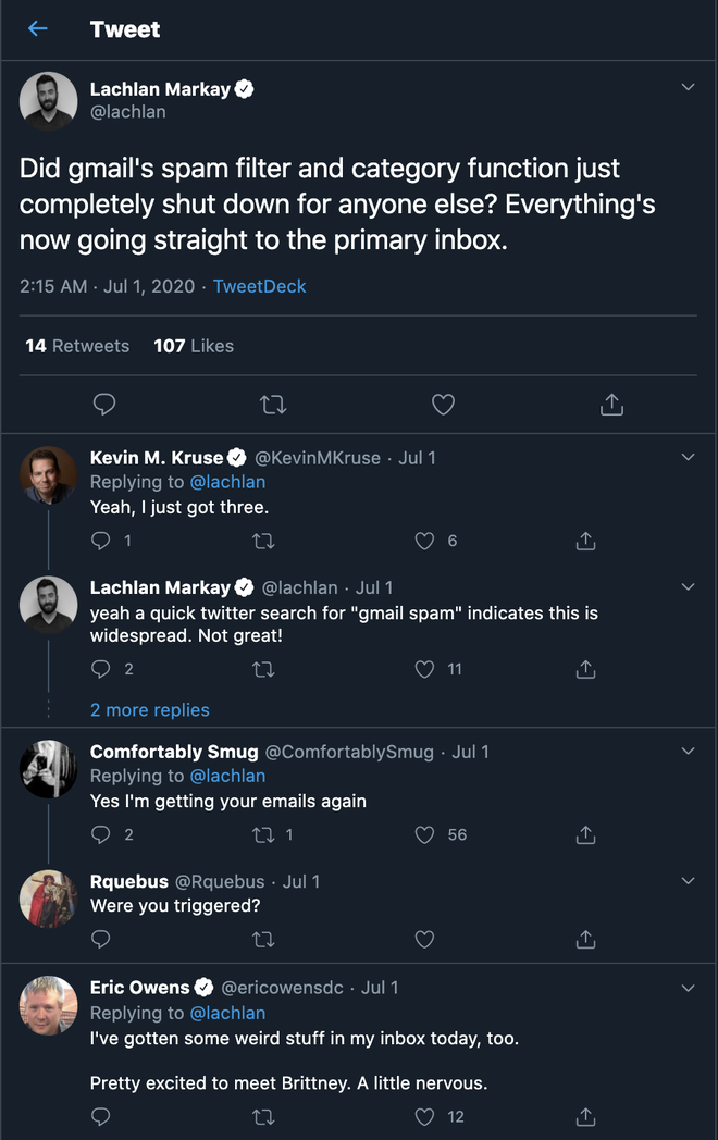 Trên mạng xă hội Twitter, nhiều người dùng xác nhận gặp vấn đề về bộ lọc thư rác trong Gmail. Ảnh: Chụp màn h́nh.