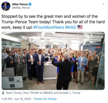 “The campaign’s lack of safety protections were visible during Vice President Mike Pence’s visit to the office last month, during which he posed for a photo with more than 70 campaign staff, closely packed together and without wearing face coverings — an image that infuriated local officials, who called on Virginia Gov. Ralph Northam to take action and enforce state public health orders on universal masking indoors and social distancing. But Northam, a Democrat, ultimately declined to do so,” reported Politico.