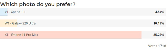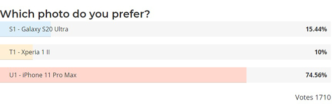 Do đó, trang tin công nghệ Phone Arena đã tiến hành kiểm tra camera giữa Sony Xperia 1 II, Samsung Galaxy S20 Ultra và iPhone 11 Pro Max thông qua bài kiểm tra ảnh “mù” – người xem không biết hình ảnh nào được chụp bởi thiết bị nào. Các tiếp cận này có phần khách quan hơn với người dùng, giúp họ dễ dàng tìm ra những chiếc điện thoại chụp ảnh tốt nhất của năm.