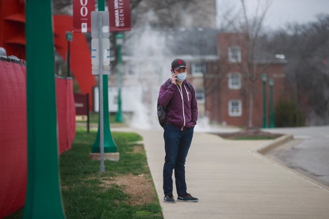 Một du học sinh đứng chờ xe buưt tại đại học Indiana, Mỹ, hồi tháng 3, sau khi trường đóng cửa do đại dịch. Ảnh: USA Today