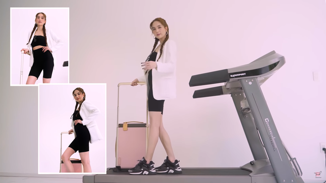 Đầu tiên, Ngọc Trinh tiết lộ cho mọi người cách cô chụp ảnh sân bay ngay trên máy chạy bộ tại nhà. Cô mặc đồ như đi du lịch, xách cả vali ra nhưng lại leo lên máy chạy bộ để tạo dáng, khiến ai cũng bất ngờ. Ngọc Trinh nói: