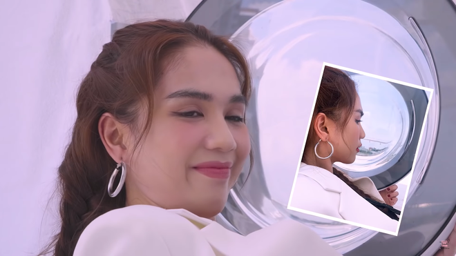 Bất ngờ nhất là cảnh Ngọc Trinh lấy cánh cửa máy giặt giả làm cửa sổ máy bay, tạo dáng như đang đi máy bay. Cô chia sẻ: