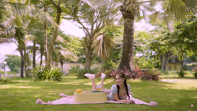 Cuối cùng, Ngọc Trinh mang thảm, đồ ăn trải ra vườn nhà để giả vờ chụp ảnh đi picnic. Cô nói: