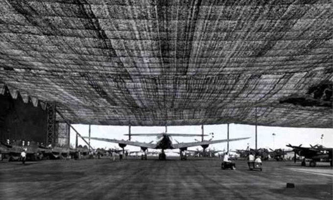 Bãi đỗ máy bay được giấu bên dưới một lưới ngụy trang của Mỹ trong Thế chiến II. Ảnh: Exclusivepix Media.