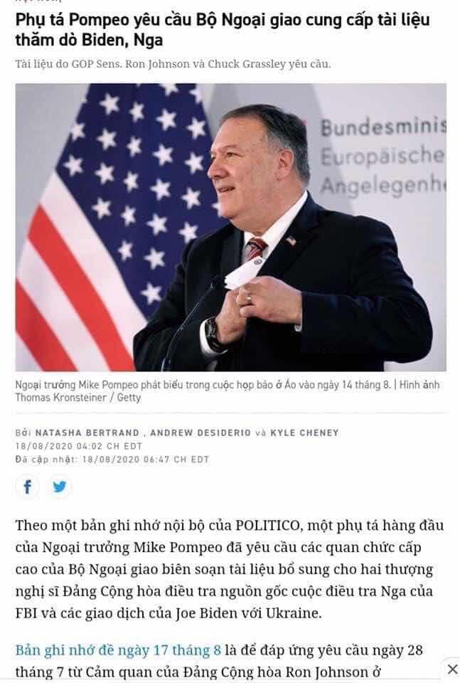 Bởi vì, nếu những kẻ mắc dịch Hội chứng loạn trí Trump vẫn khư khư ôm cái ảo tưởng trộn với những vu cáo ngu ngốc kia để tiếp tục tấn công vào uy tín của Donald Trump thì chính Joe Biden mới là kẻ dính trọn máu phun từ miệng của chúng kể cả Hillary Clinton, John Kerry cũng bị vạ lây. Rõ ràng, chuyện cha con Joe Biden có các áp phe tham nhũng đã và đang bị phơi bày trên truyền thông kể cả bản thân của Joe Biden đã nhiều lần khoe khoang chuyện lão ta gây áp lực lên chánh phủ của Ukraine để sa thải tổng công tố viên Shokin khi ông này rờ tới Burisma, nơi Hunter Biden hưởng lợi hàng triệu Mỹ kim dù không có nghề ngỗng chuyên môn.
