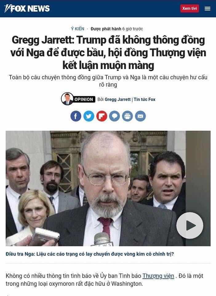 Trong lúc phía Công tố viên đặc biệt John Durham thông báo cựu luật sư FBI đã nhận tội khi cố tình sửa nội dung email để vu cáo Nga can thiệp bầu cử giúp ông Trump thắng bà Hillary Clinton thì Ủy ban Tình báo Thượng viện đã bạch hóa, rửa oan cho ông Trump, một nỗi oan mà kể cả các Thượng nghị sĩ Cộng Hòa không ưa Trump cũng đã tin rằng ông Trump đã thông đồng với Nga trong cuộc bầu cử Tổng thống năm 2016.