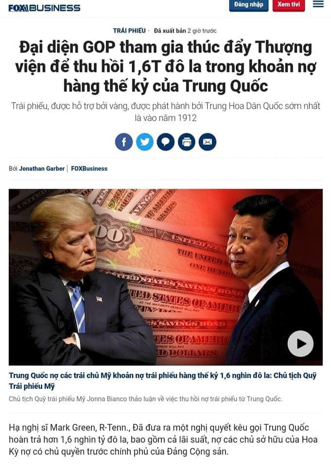 6. Thượng nghị sĩ và Hạ nghị quyết đang khẩn trương thông qua nghị quyết để đòi món nợ 1,6 tỷ Mỹ kim thời Nhà Thanh cho các trái chủ Mỹ. Nếu Tàu cộng không trả sẽ bị các tổ chức tài chánh quốc tế xếp hạng "quốc gia vỡ nợ có kiểm soát", cơ hội vay mượn của Tàu cộng sẽ mất, cổ phiếu của Tàu cộng sẽ giảm giá sâu, tài sản công của Tàu cộng ở nước mắt sẽ bị đóng băng, tịch thu khấu trừ vào món nợ 1,6 ngàn tỷ Mỹ kim.