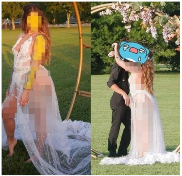 Tuy nhiên, cô dâu trong trường hợp này lại nhận nhiều lời chỉ trích và chê bai khi lựa chọn chiếc váy cưới gây sốc. Theo đó, 2 bức hình được chia sẻ trên mạng xã hội Reddit cho thấy, cô dâu lựa chọn một chiếc váy cưới rất mỏng, có thể nhìn xuyên thấu cả đồ lót bên trong. Phần ngực cũng được cắt xẻ đầy táo bạo khiến ai nhìn vào cũng phải đỏ mặt.