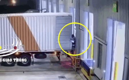 Trong đoạn clip ghi lại diễn biến vụ việc, người đàn ông đứng phía sau đuôi xe container. Người này ra hiệu cho chiếc xe lùi xuống nhưng bất ngờ gặp "biến".