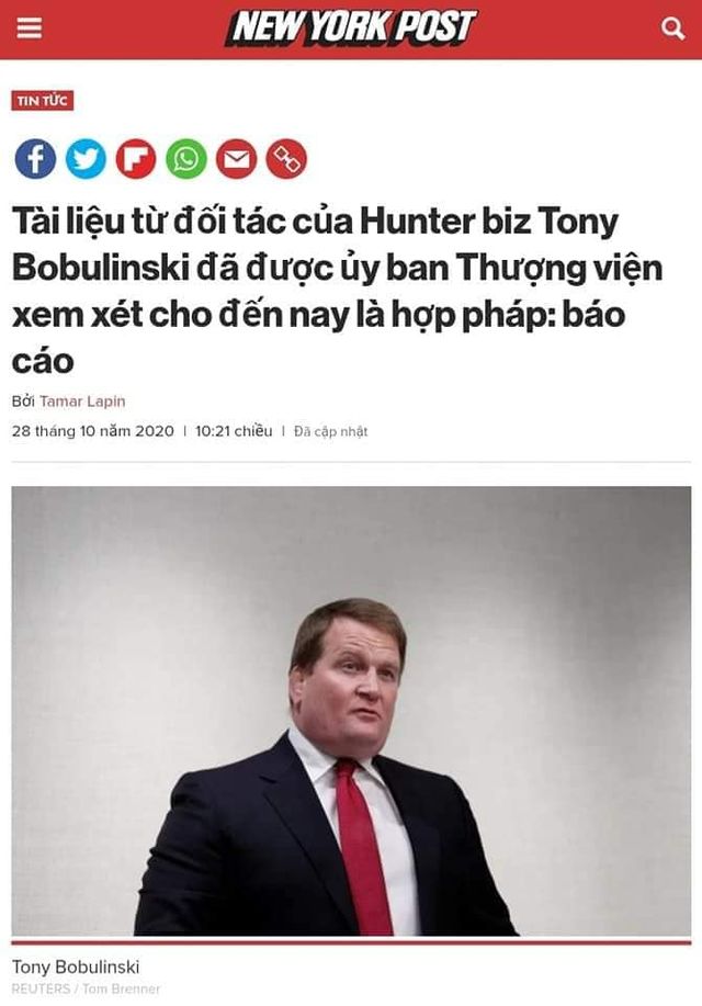 Hiện nay, ngoài các máy tính xách tay địa ngục của H.unter B.iden mà ông Giuliani có, các ủy ban Thượng viện có,... thì lời chứng từ đối tác của H.unter B.iden là ông Tony Bobulinski cũng là bom tấn nổ tung danh gia vọng tộc của gian đảng O.bama - J.oe B.iden và đám chánh trị gia bẩn thỉu đã ngập miệng tệ Tàu cộng.
