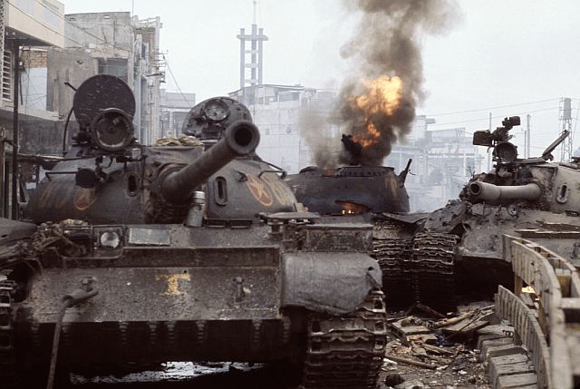 Một con trâu sắt đen thui từ từ húc về hướng cổng số 1, khoảng 10 giờ 30 sáng, chiếc T54 nghiền xích sắt gầm gừ tiến dần về cổng chính. Không biết bao nhiêu cặp mắt bên ngoài nh́n vô, không biết bao nhiêu cặp mắt bên trong nh́n ra, cả dân lẫn lính hai phe đối chiến. Mọi người nín thở, hồi hộp, họ chờ một tiếng nổ của hỏa tiễn M72 phóng vào chiến xa địch. Nhưng lạ lùng thay, bên ta không ai bắn một phát nào, trong lúc chiến xa địch ủi toạc hàng rào kẽm gai pḥng thủ chắn trước cổng số 1, vừa qua khỏi cổng vừa tác xạ bừa vào Huấn Khu. Đơn lẻ chỉ có một chiếc, rơ ràng không phải chiến xa đi lạc đường, Bắc quân đang giở tṛ ǵ đây?