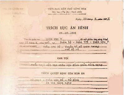 Tôi ôm trên tay tài sản quư nhất, đó là cái bao thư lớn đựng di ảnh của chồng tôi, một vài tấm h́nh thời chúng tôi yêu nhau, và bản án tử h́nh.