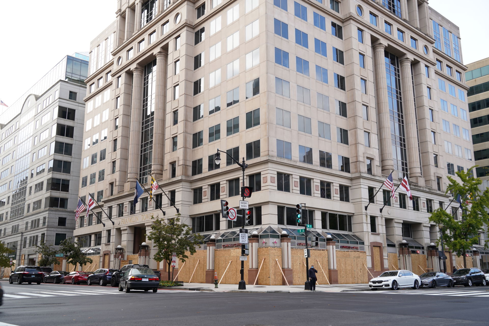 Bắt đầu từ đầu ngày Thứ Bảy, 30 Tháng Mười, các cửa tiệm kinh doanh lớn nhỏ ở khu vực gần Tòa Bạch Ốc, Capitol Hill, Tối Cao Pháp Viện, công viên Lafayette, công viên McPharson đã bắt đầu bao bọc cửa kính.
