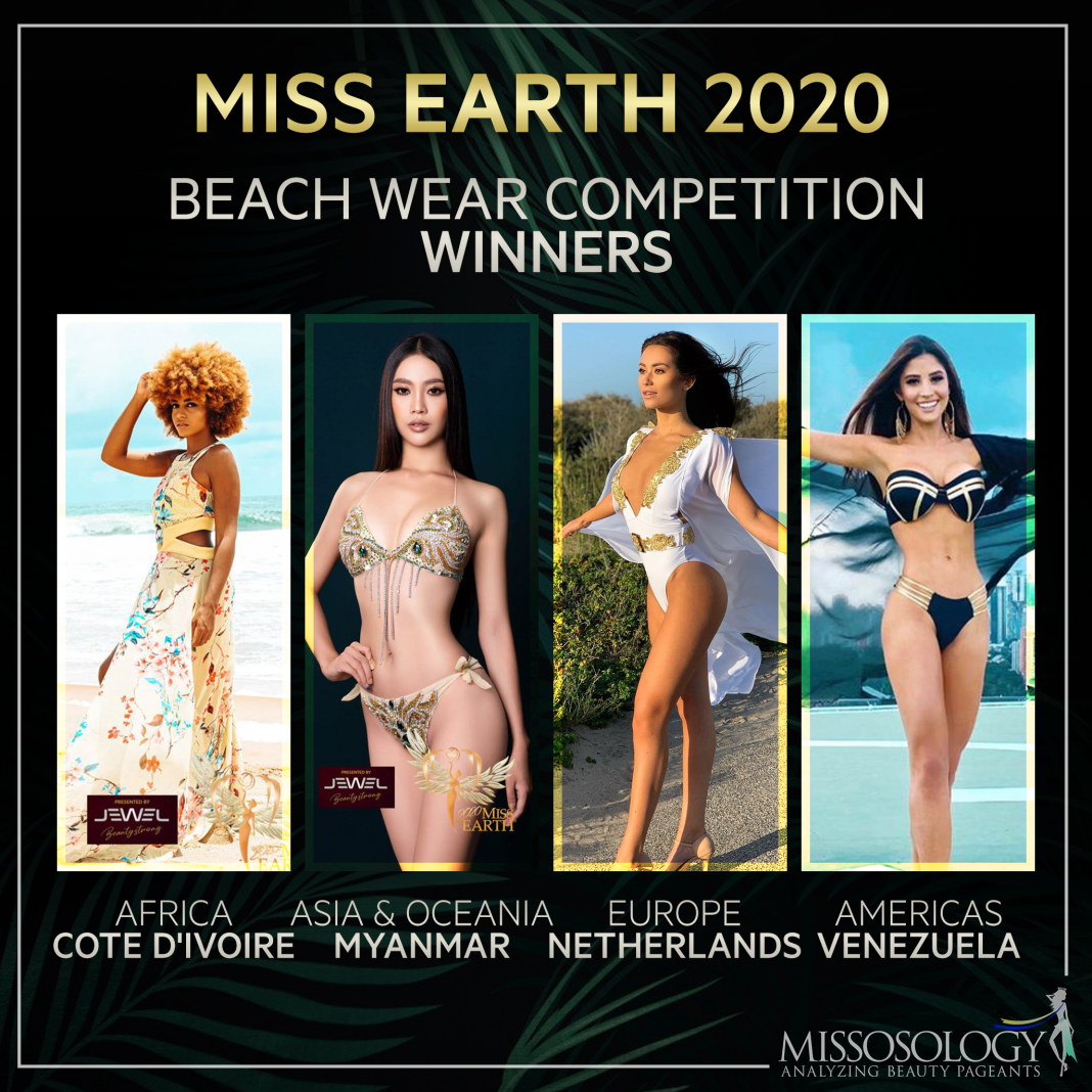 Mới đây, chuyên trang Missosology gây chú ý khi công bố top 4 vòng thi bikini của Hoa hậu Trái Đất 2020. Theo chuyên trang sắc đẹp uy tín này, 4 mỹ nhân mặc trang phục bikini gợi cảm nhất cuộc thi gồm đại diện: Myanmar (châu Á - châu Đại Dương), đại diện Bờ Biển Ngà (châu Phi), Hà Lan (châu Âu) và Venezuela (châu Mỹ). Người đẹp chiến thắng chung cuộc sẽ được xướng tên tại Chung kết Hoa hậu Trái đất 2020 diễn ra chiều 29/11 tới đây.
