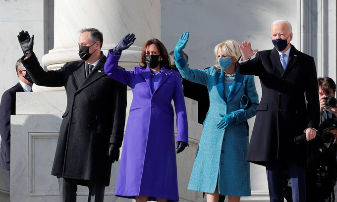 Vợ chồng Biden (giữa) cùng vợ chồng Harris (trái) ở Đồi Capitol hôm 20/1. Ảnh: Reuters.