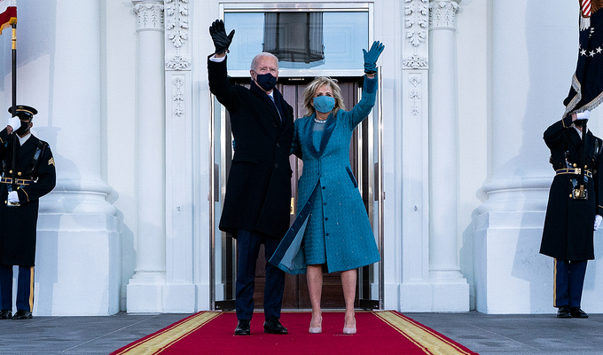 Trong chương trình đặc biệt "Chúc mừng nước Mỹ" tối hôm đó do tài tử Tom Hanks dẫn dắt, phu nhân tân tổng thống Joe Biden mặc chiếc áo khoác màu trắng ngà làm từ chất liệu len cashmere và váy lụa cùng tông, đều được thêu những bông hoa nhiều màu sắc, theo thông cáo báo chí từ nhà thiết kế.