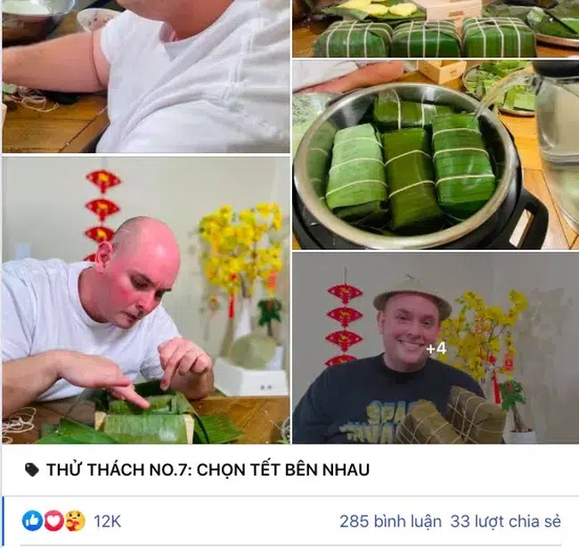 Một câu chuyện gói bánh Chưng đón Tết của Trang Anh gây chú ư mạng xă hội. Cô cùng anh chồng người Mỹ của ḿnh tỉ mỉ bên lá chuối, nếp, đỗ, thịt mỡ… để gói bánh đón Tết. H́nh ảnh anh chồng Tây cẩn thận cùng vợ gói bánh khiến ai nấy xuưt xoa. Do đam mê văn hóa và ẩm thực Việt Nam, chàng rể Mỹ thật biết cách khiến cô vợ xinh xắn thấy ấm ḷng trong những ngày đầu năm mới.