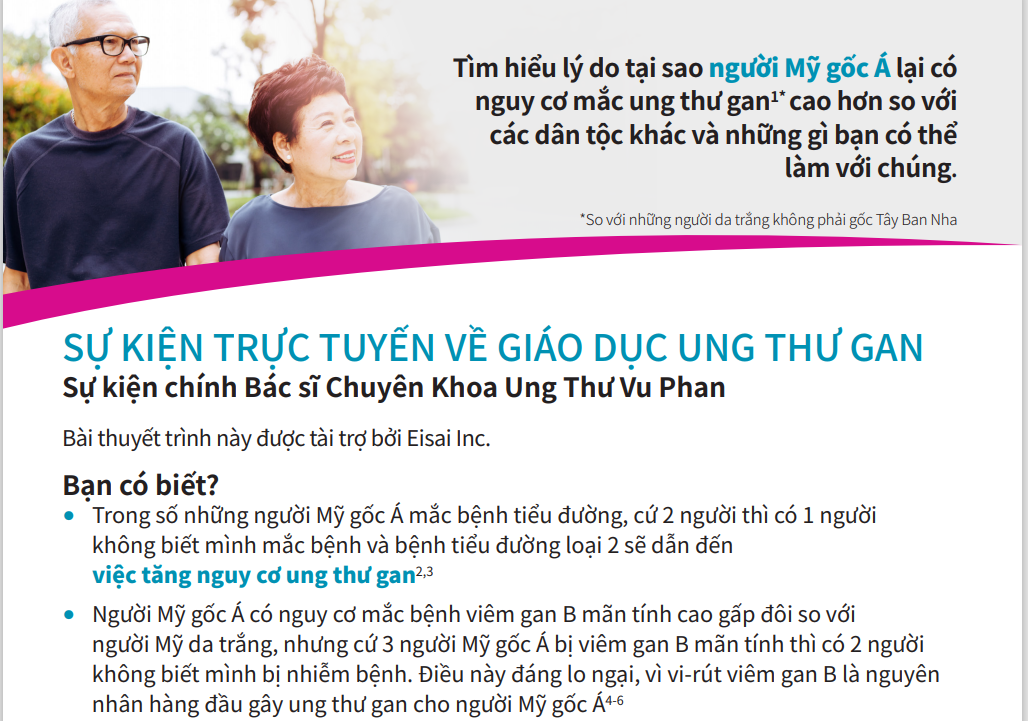 Điều này đáng lo lắng vì virus viêm gan B là nguyên nhân hàng đầu gây ung thư gan cho người Mỹ gốc Á. Vì vậy, bác sĩ Chuyên Khoa Ung Thư Vũ Phan sẽ có một sự kiện trực tuyến về giáo dục ung thư gan diễn ra vào Thứ Hai (ngày 8/3) lúc 6:00-7:00 giờ tối giờ miền Tây 9:00-10:00 giờ tối miền Đông.